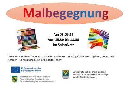 Malbegegnung in Weißwasser Der Generationstreff SpinnNetz des Schlupfwinkels lädt am 8.9.2025 in der Zeit von 15.30 bis 18.30 Uhr in sein Domizil am Sorauer Platz 1 in Weißwasser zur Malbegegnung ein. Diese Veranstaltung findet im Rahmen des EU-geförderten Projektes „Geben und Nehmen – Generationen, die miteinander leben“ statt. Dazu Tanja