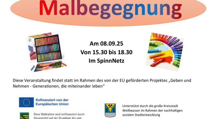 Der Generationstreff SpinnNetz des Schlupfwinkels lädt am 8.9.2025 in der Zeit von 15.30 bis 18.30 Uhr in sein Domizil am Sorauer Platz 1 in Weißwasser zur Malbegegnung ein. Diese Veranstaltung findet im Rahmen des EU-geförderten Projektes „Geben und Nehmen – Generationen, die miteinander leben“ statt.